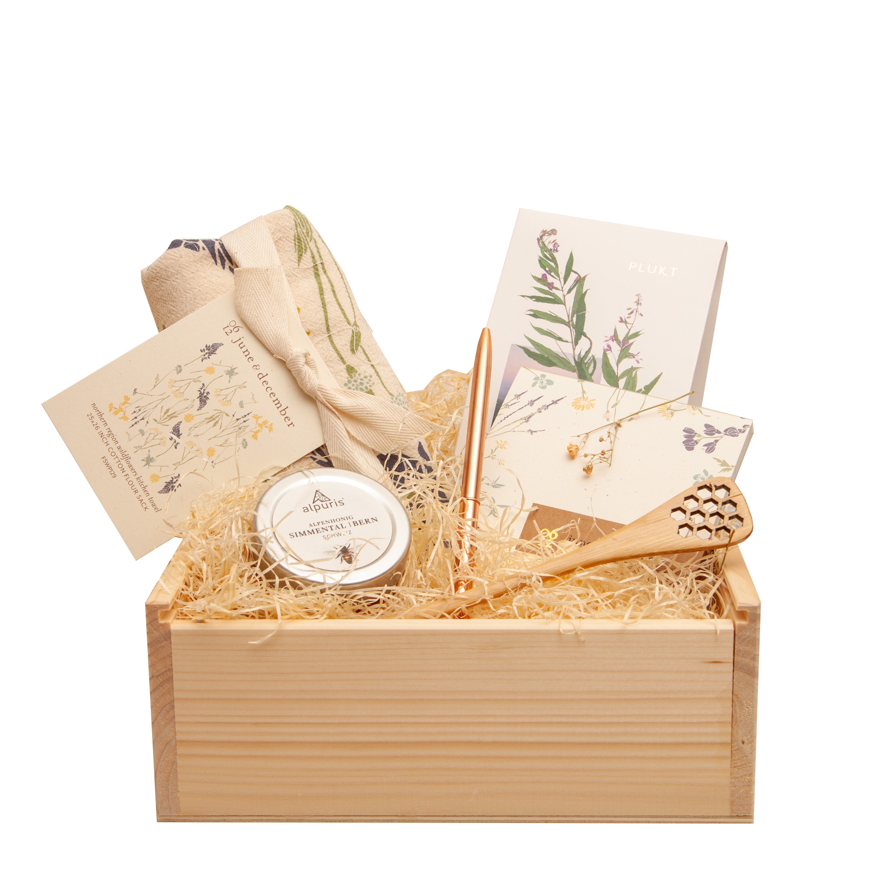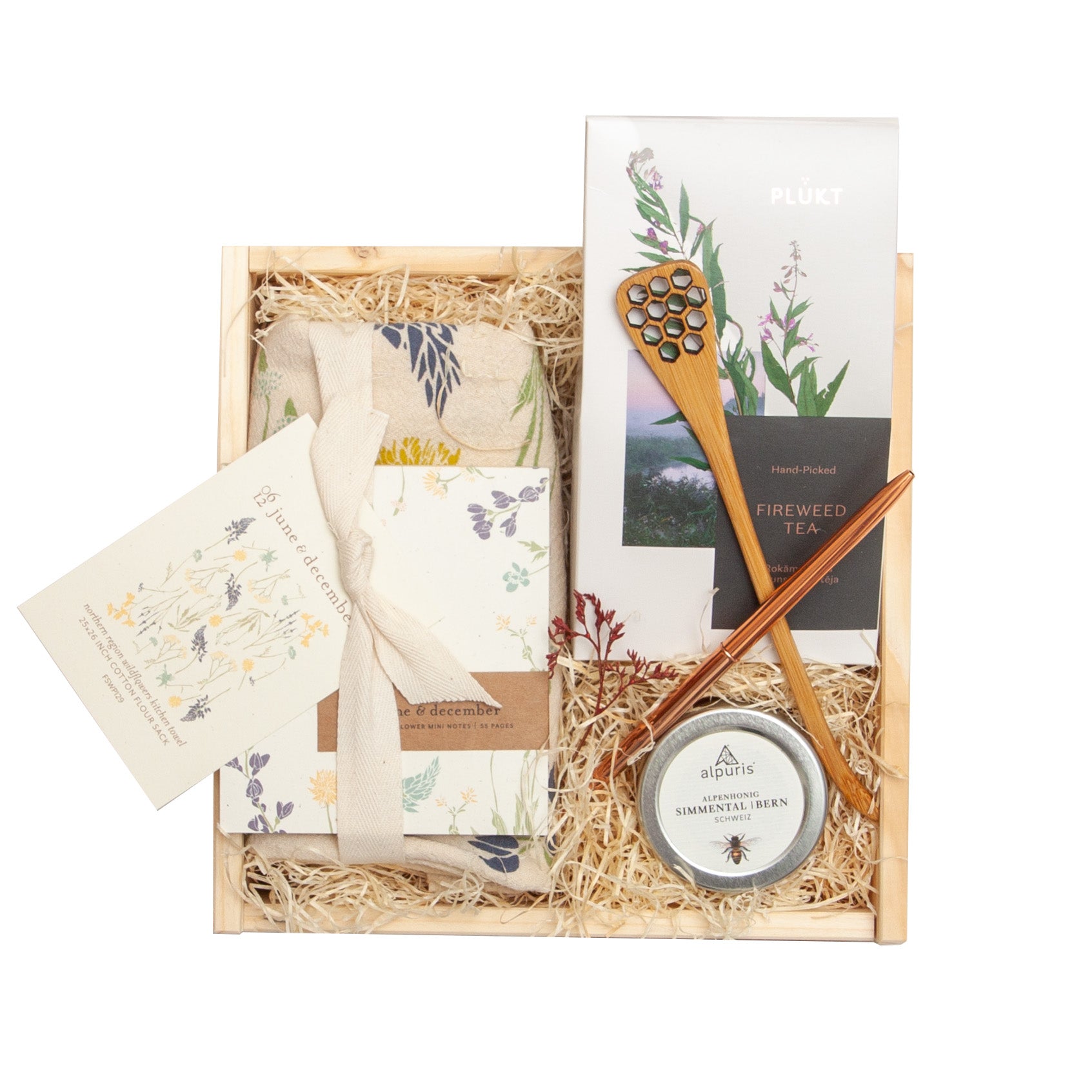 Bestow the healing powers of 'Alpine Bee' gift box upon someone who needs it the most. Soothe the body and soul with these natural products. Honey combined with fireweed herbal tea brings such a comforting moment, plus beautiful tea towel and notepad to complete the wild nature feeling.