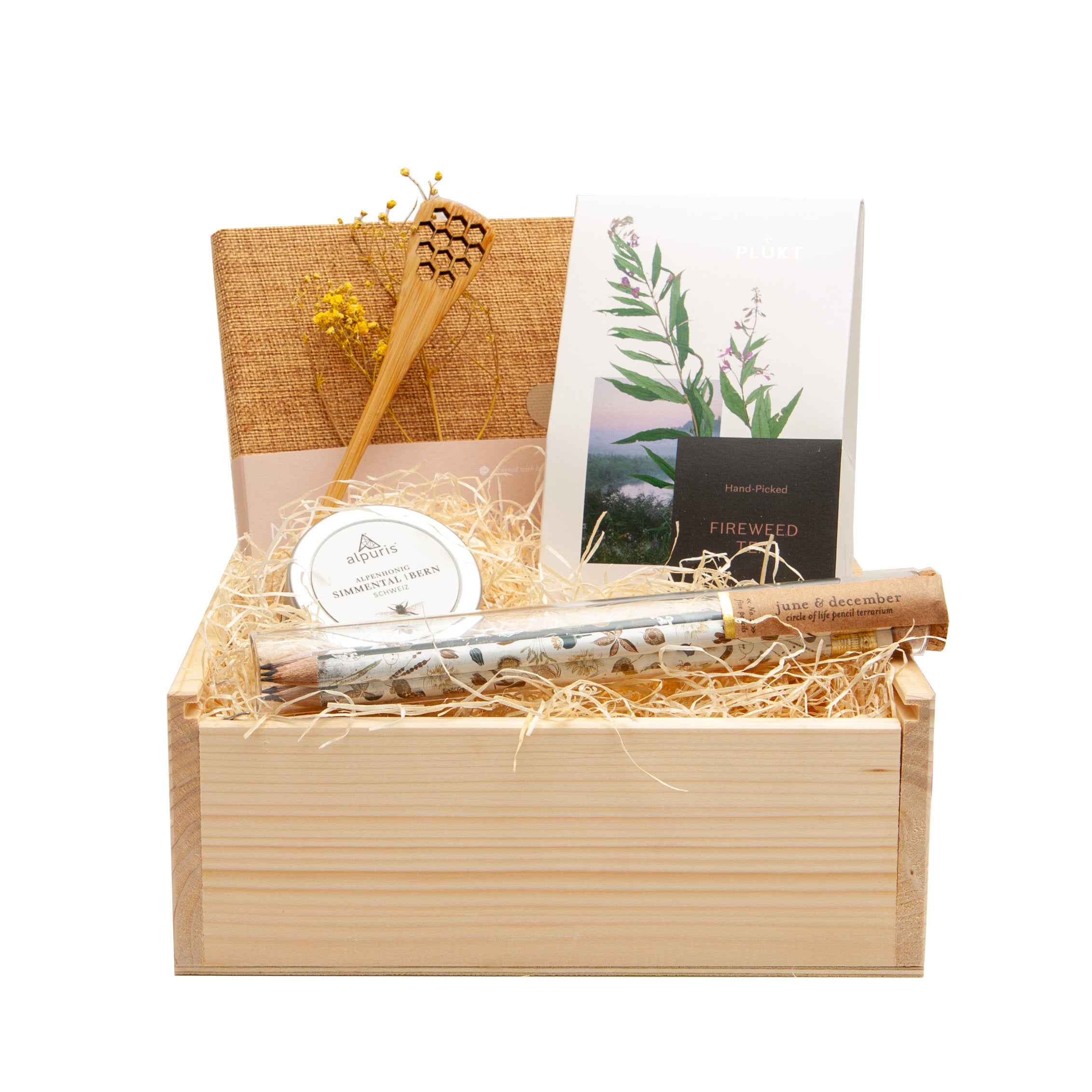 Bestow the healing powers of 'Alpine Bee' gift box upon someone who needs it the most. Soothe the body and soul with these natural products. Honey combined with fireweed herbal tea brings such a comforting moment, plus notepad with terrarium pencils to complete the wild nature feeling.